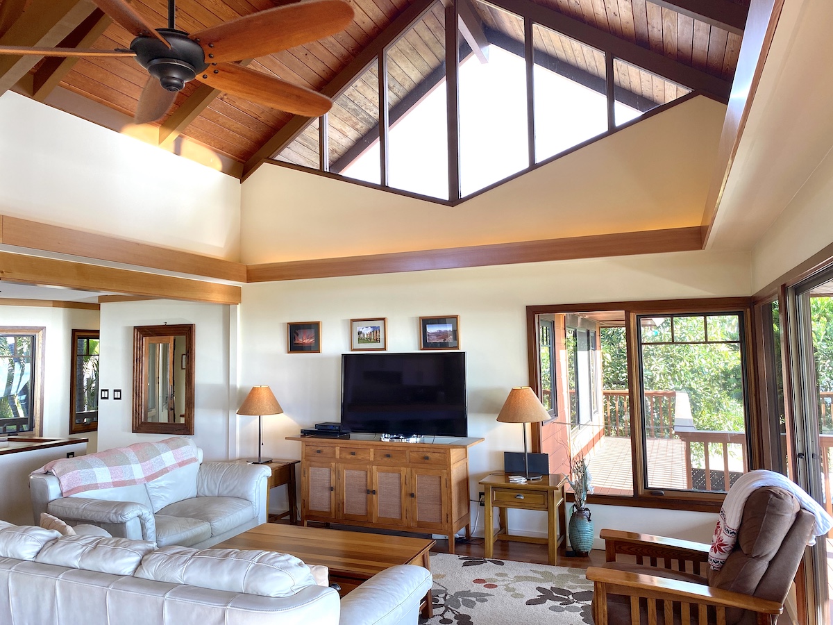 The property is lush and tropical with mature vegetation on all sides. The landscaping includes a Plumeria grove (the flowers that make the lei wreaths). At the front entry there are two enchanting waterfalls when you approach the doors.